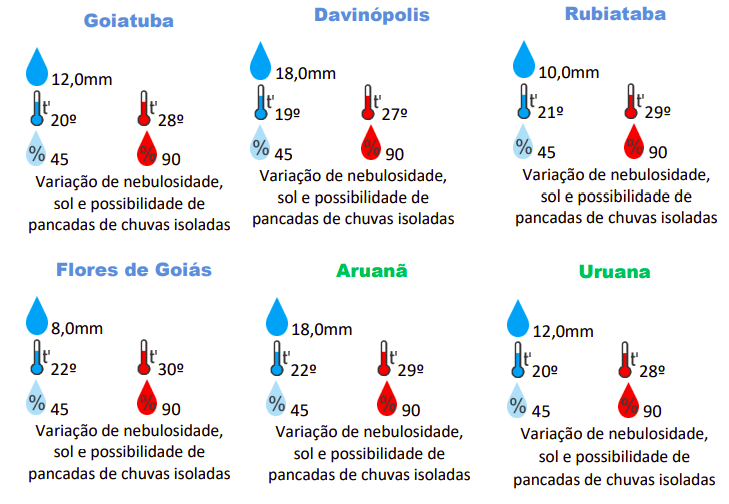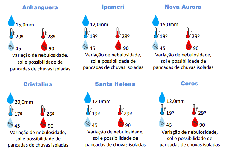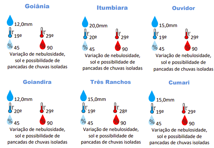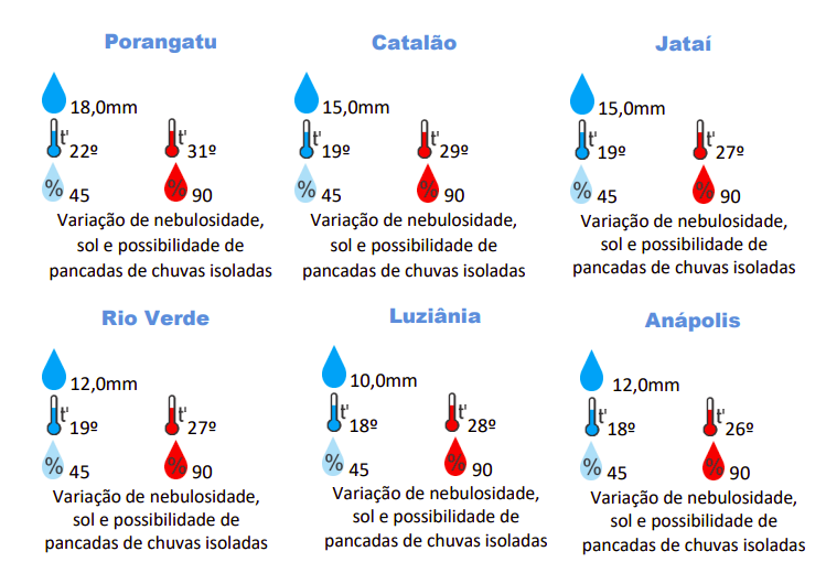 Os municípios de Goiás com a previsão de maior temperatura são Poragantu e Flores de Goiás, com 31ºC e 30ºC respectivamente. Outras cidades como Catalão, Anápolis e Rio verde devem variar com máximas entre 27ºC e 29ºC. Veja abaixo a previsão completa divulgada pelo CIMEHGO.