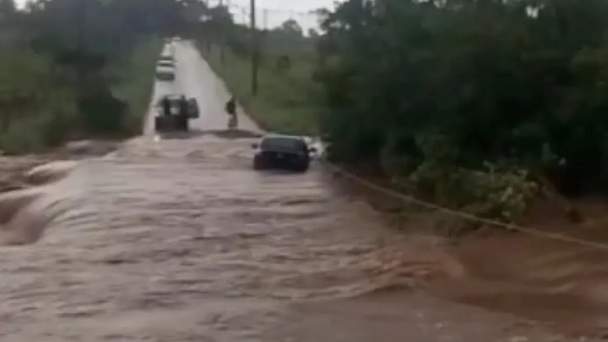 O motorista de um carro viveu momentos de tensão ao tentar atravessar uma ponte durante uma enchente em Luziânia, no Entorno do Distrito Federal, na segunda-feira (15). O condutor ficou preso no veículo após o córrego transbordar e alagar a ponte durante forte chuva. A vítima escapou ilesa graças ao uso de coletes salva-vidas e cordas usados pelo Corpo de Bombeiros.