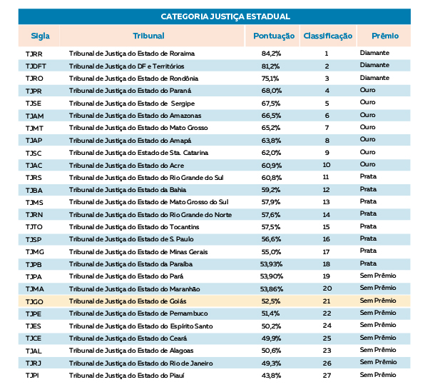 Dependendo da pontuação, as cortes estaduais foram classificadas nas categorias de Diamante, Ouro e Prata. A corte de Justiça goiana não conseguiu se encaixar em nenhum delas e ficou sem prêmio. Goiás ficou em 21º colocação e ficou à frente apenas dos tribunais de Justiça de Pernambuco, Espírito Santo, Ceará, Alagoas, Rio de Janeiro e Piauí.