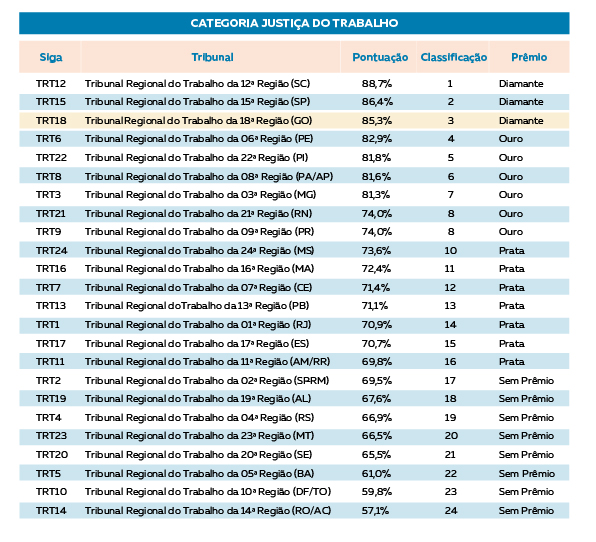 Na categoria de Justiça do Trabalho, o Tribunal Regional do Trabalho da 18ª Região (TRT-GO) foi a corte goiana de maior destaque com a pontuação de 85,3% e ficar em terceiro lugar no ranking. O TRT-GO recebeu o certificado de “Diamante” e ficou atrás somente dos tribunais de São Paulo e Santa Catarina.