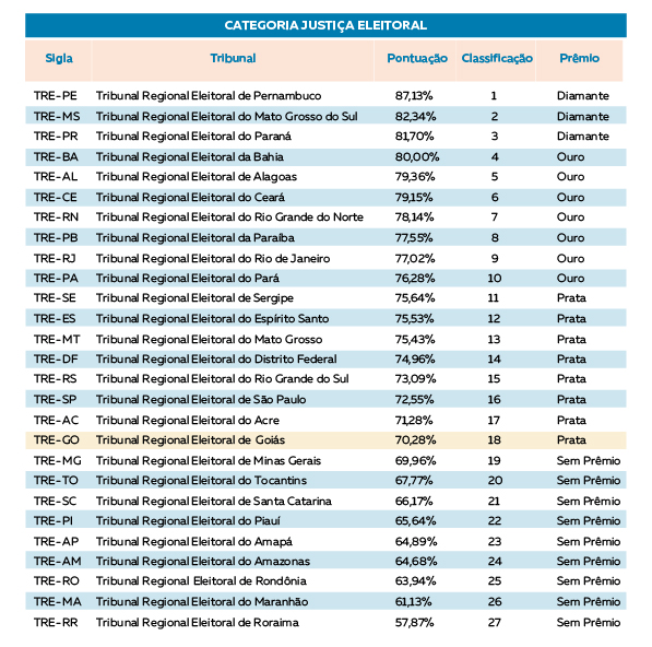Na categoria de Justiça Eleitoral, o Tribunal Regional Eleitoral de Goiás (TRE-GO) ficou em 18º lugar, com 70,28% e foi o último a receber o prêmio da categoria “Prata”. Nesta categoria, o TRE de Pernambuco foi o mais bem colocado, com 87,13% de pontuação.