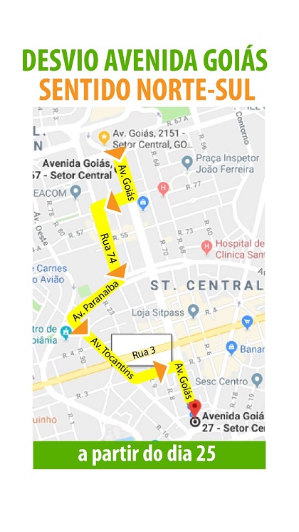 O trânsito na região sofrerá uma série de desvios. O motorista que vem pela Avenida Goiás deverá virar à direita na rua 61, depois seguir pela Avenida Paranaíba, Avenida Tocantins, virar à esquerda na Rua 3 e depois seguir novamente pela Avenida Goiás.