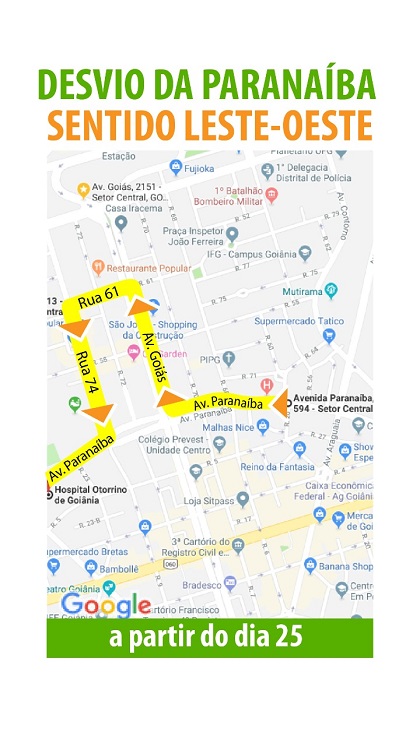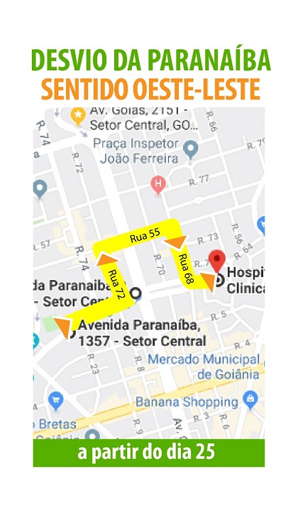 Já os motoristas que vêm pela Avenida Paranaíba no sentido leste / oeste devem virar na Avenida Goiás, seguir pela Rua 61, virar na Rua 74 e voltar à Avenida Paranaíba.