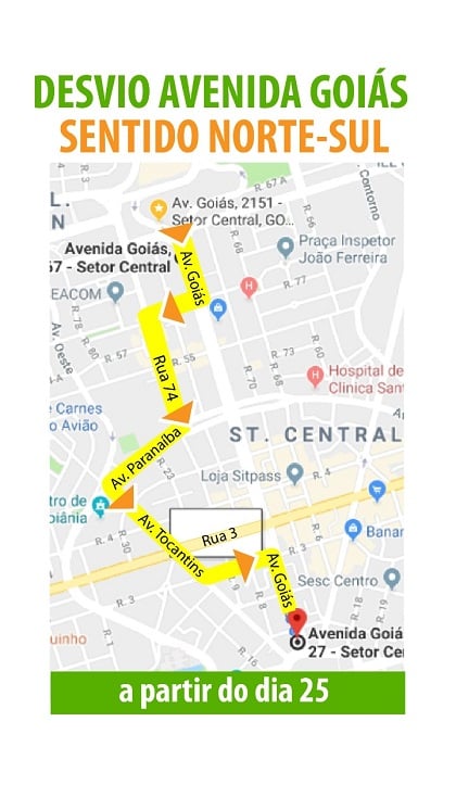 O trânsito na região sofrerá uma série de desvios. O motorista que vem pela Avenida Goiás deverá virar à direita na rua 61, depois seguir pela Avenida Paranaíba, Avenida Tocantins, virar à esquerda na Rua 3 e depois seguir novamente pela Avenida Goiás.