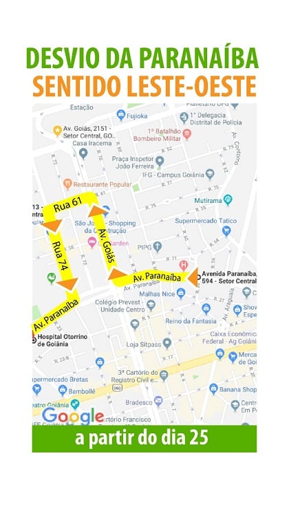 Já os motoristas que vêm pela Avenida Paranaíba no sentido leste / oeste devem virar na Avenida Goiás, seguir pela Rua 61, virar na Rua 74 e voltar à Avenida Paranaíba.