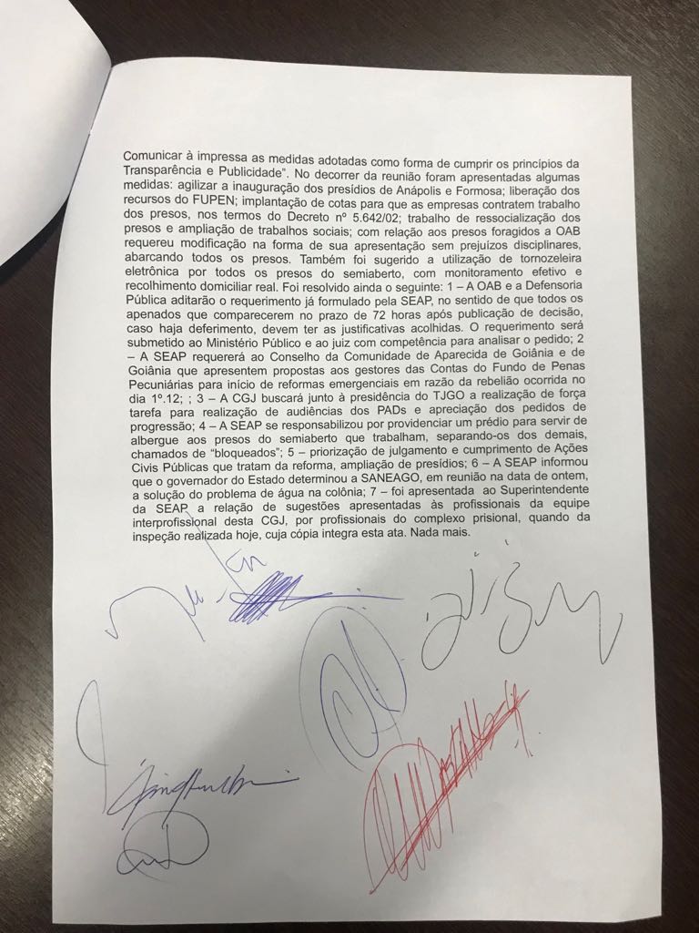 Um novo prédio servirá de albergue para os presos que possuem um trabalho registrado na Carteira de Trabalho e Previdência Social (CTPS), segundo a ata. O fornecimento de água, que estava irregular, segundo denúncia de presos, deverá ser regularizado por parte da Saneago, por determinação do governador, ainda diz a ata. A reforma da unidade destruída durante a rebelião deverá acontecer logo após o levantamento de fundos.