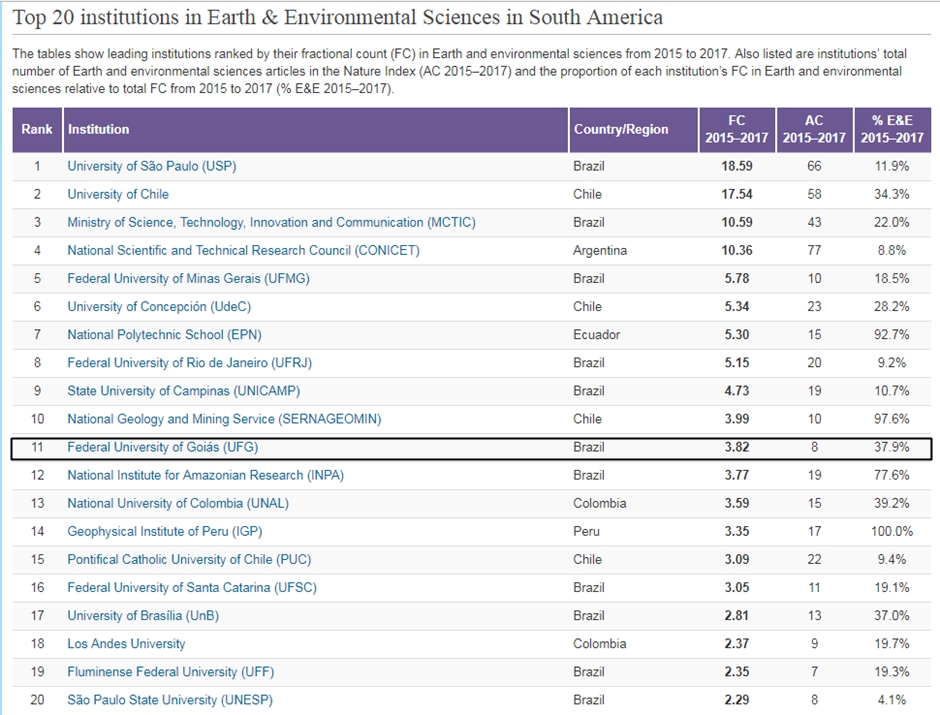 A Universidade Federal de Goiás (UFG) está entre as 20 melhores instituições Sul-Americanas no que diz respeito às produções na área de Ciências Exatas e da Terra. O ranking é do Nature Index, um banco de dados sobre publicações, autorias e produtividade dos pesquisadores.