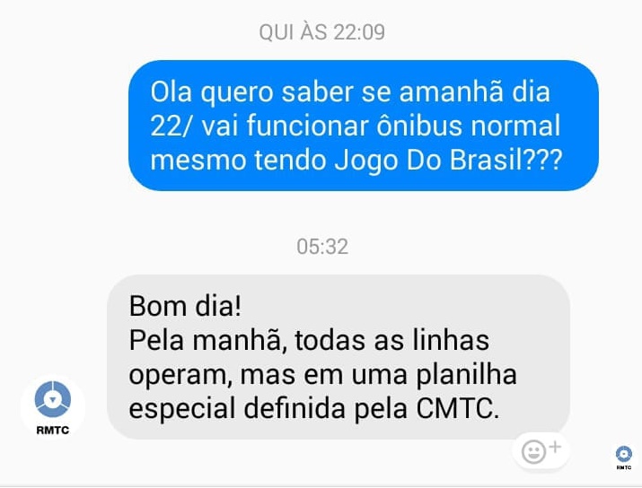 Um leitor do Mais Goiás enviou uma foto de uma conversa em uma rede social na página da Redemob, no qual a empresa responde que todas as linhas estão funcionando, mas em uma planilha especial definida pela Companhia Metropolitana de Transporte Coletivo (CMTC).