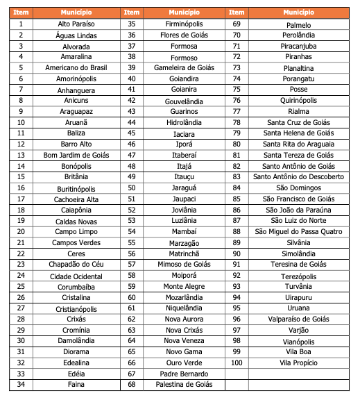 O governo estadual divulgou a lista dos 100 municípios goianos que serão contemplados na primeira fase do programa Goiás em Movimento (eixo Municípios), que prevê investimento de R$ 200 milhões em obras de recuperação de asfalto. Estes municípios foram escolhidos com base em critérios estipulados pelo Instituto Mauro Borges (IMB) e levam em conta, por exemplo, o grau de urgência de cada um no que tange à recuperação da malha viária urbana.