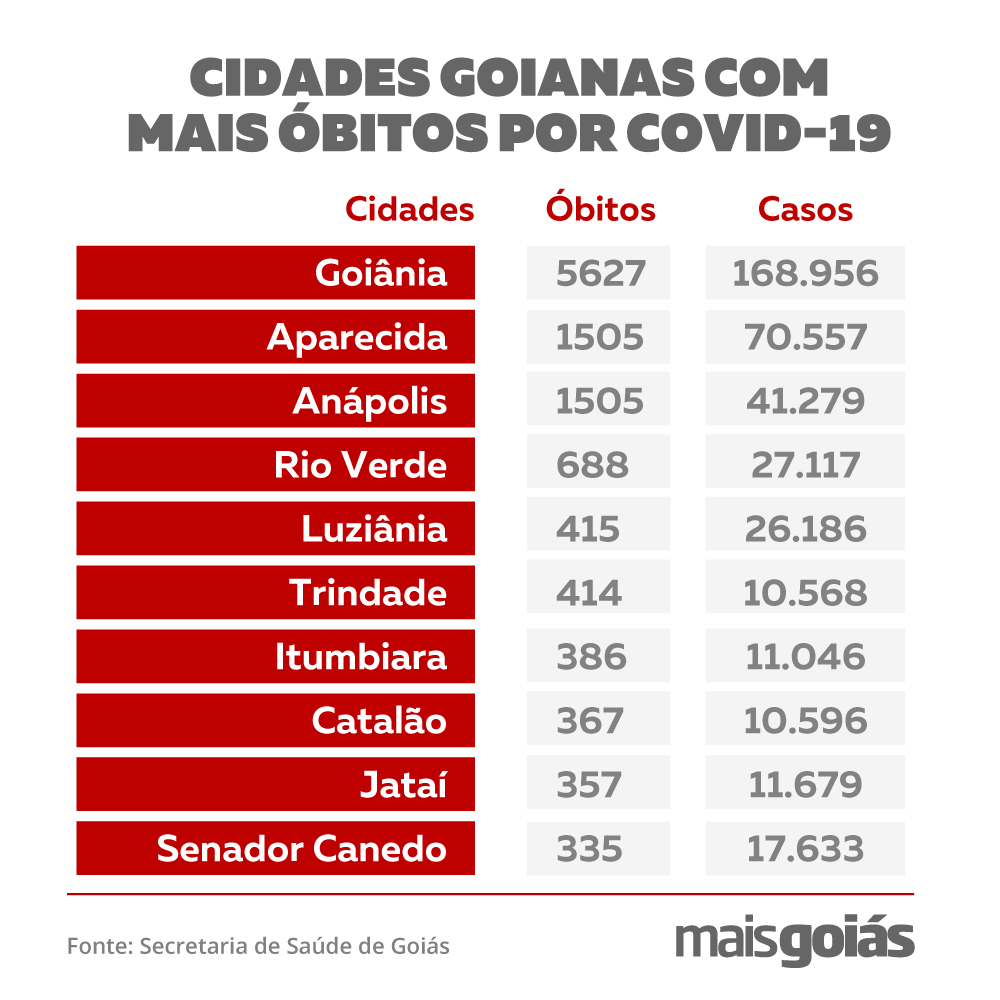 Conforme a pasta estadual, a região Metropolitana de Goiânia lidera a lista de municípios com mais mortes em decorrência das complicações do coronavírus. Goiânia é a primeira do ranking geral, com 5.627 registros, seguida de Aparecida (1.505). Trindade e Senador Canedo, pertencentes à região, aparecem em 6º e 10º lugar, com 414 e 335 óbitos, respectivamente.
