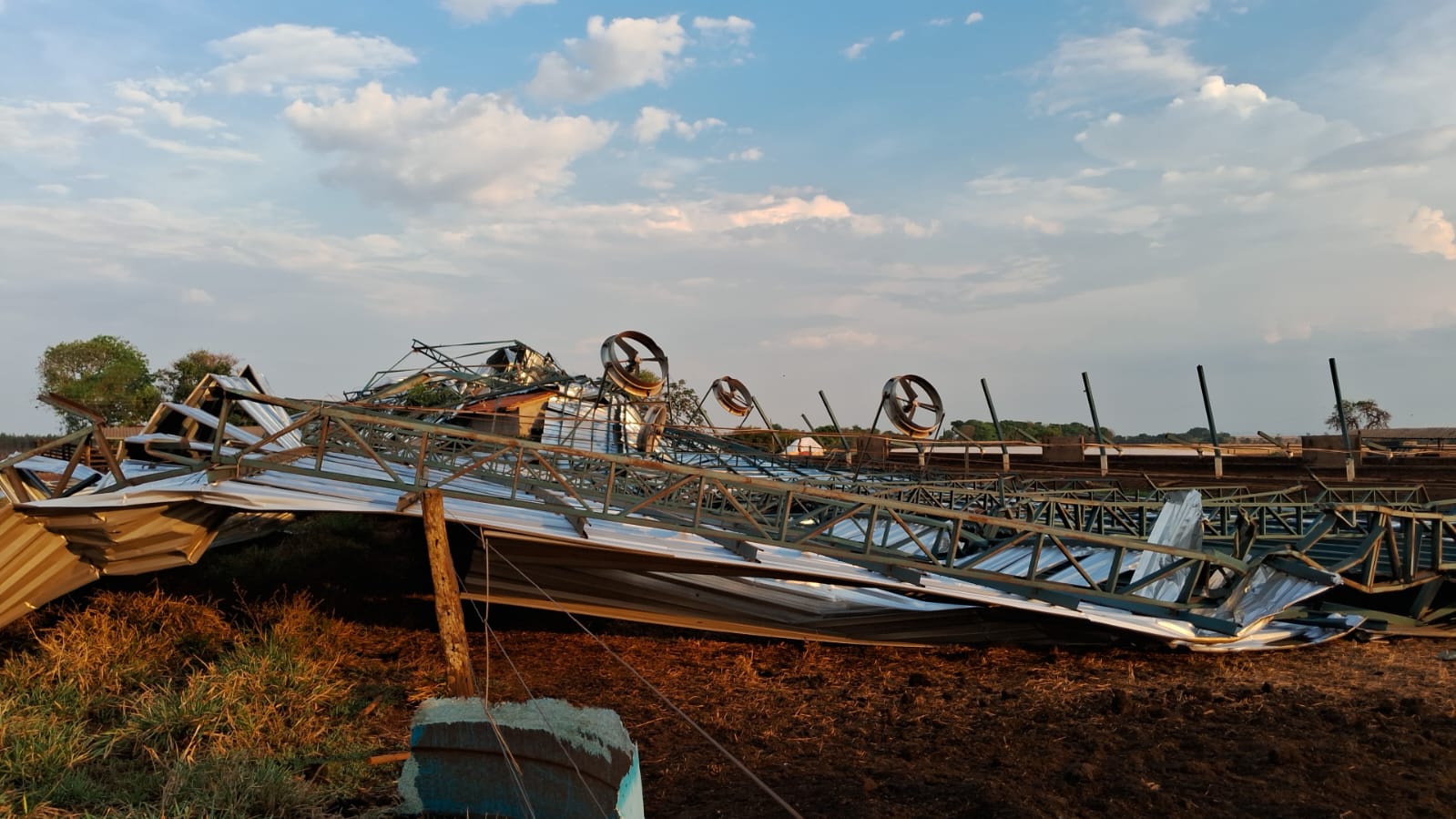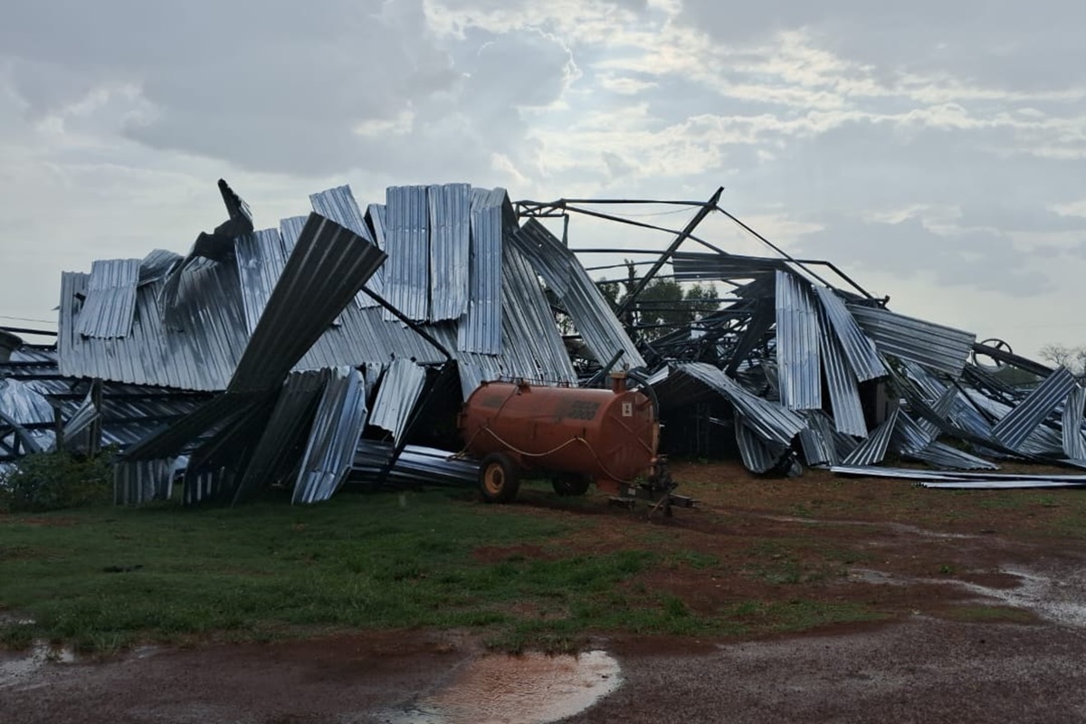 Em relação ao vendaval, o produtor rural afirma que os fortes ventos duraram menos de um minuto e derrubaram colunas de ferro e concreto. “Algo nunca visto.”