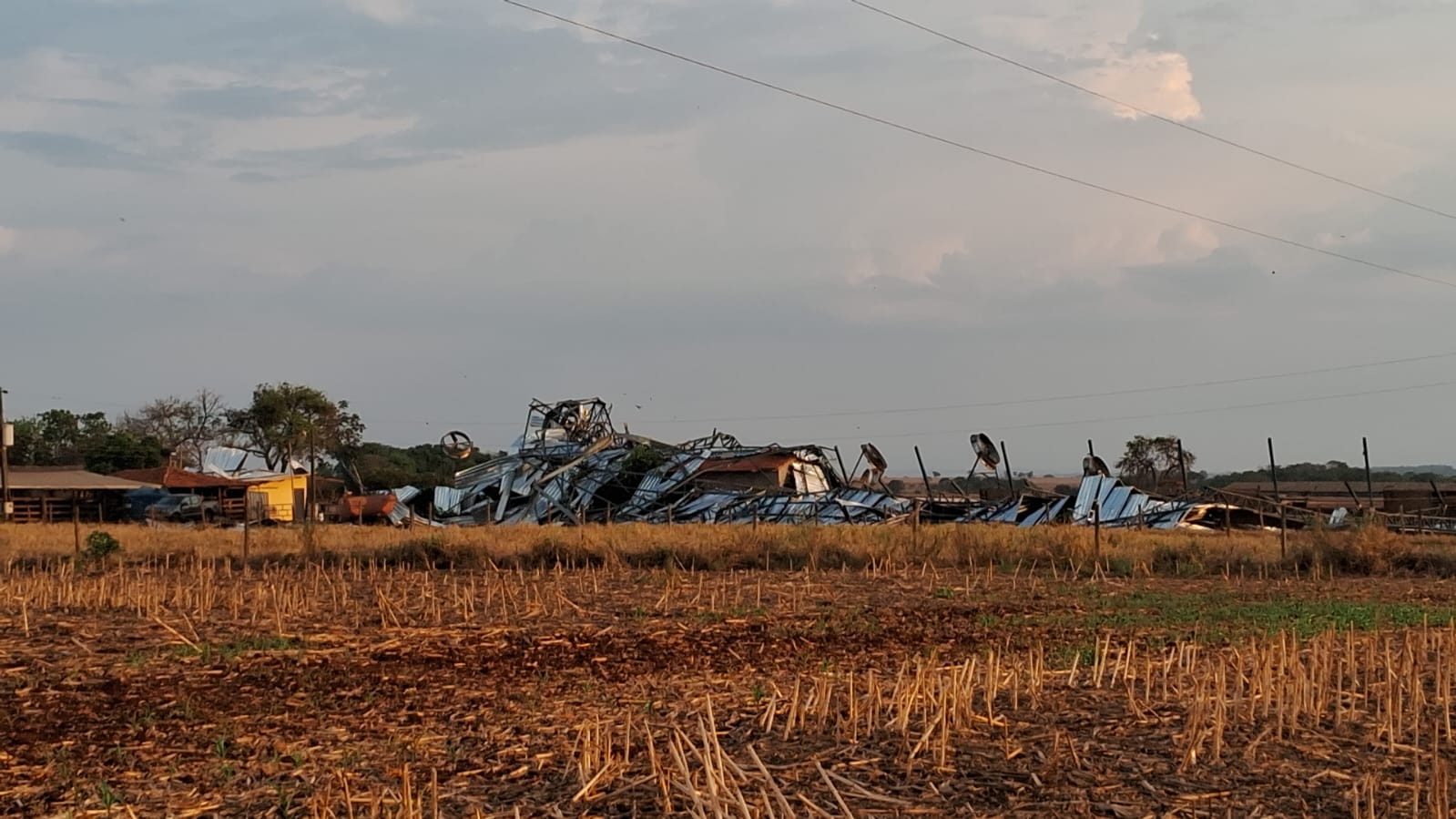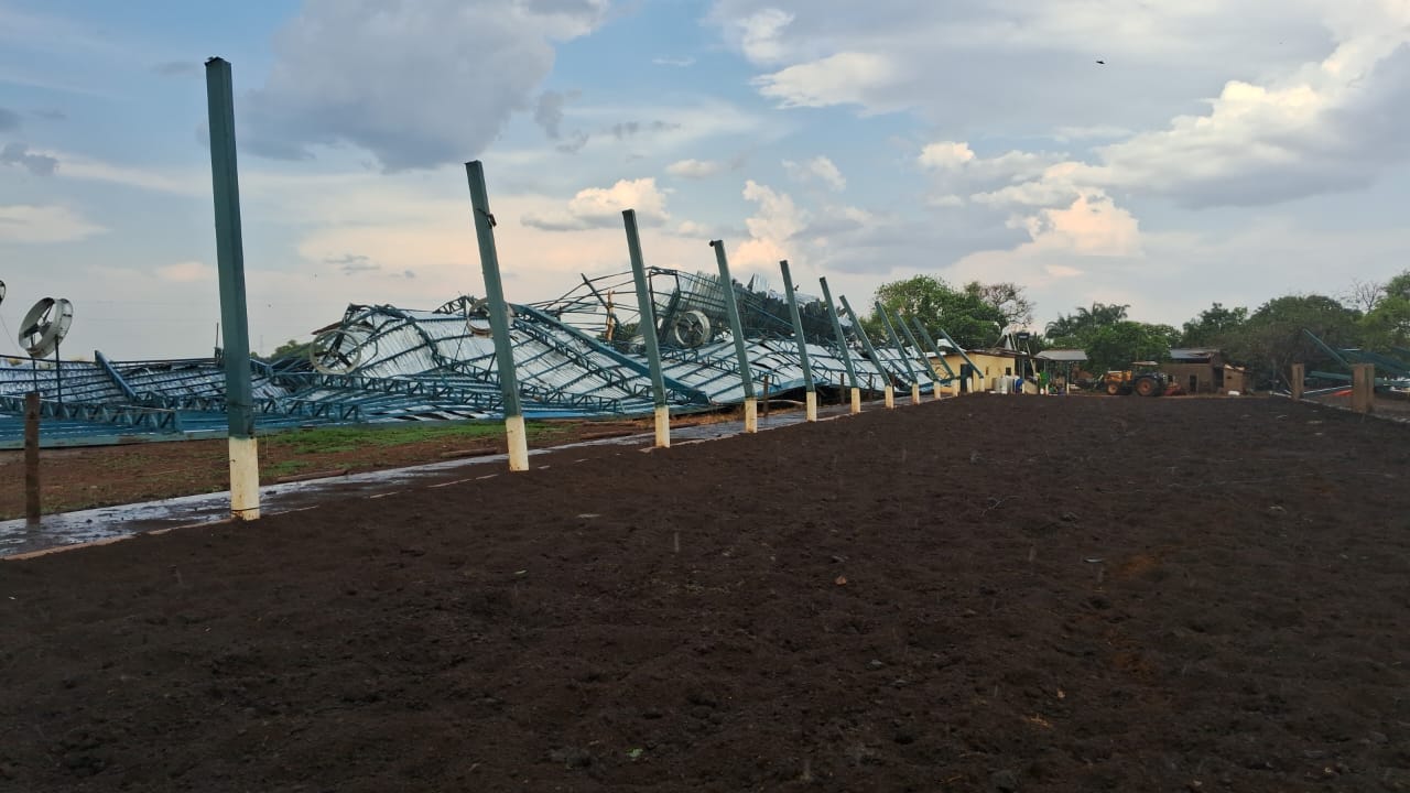 Um vendaval destruiu um galpão que abriga um rebanho bovino de leite na zona rural de Firminópolis, a cerca de 118 km de Goiânia, nesta tarde de segunda-feira (2). O local serve para espera da ordenha de vacas.