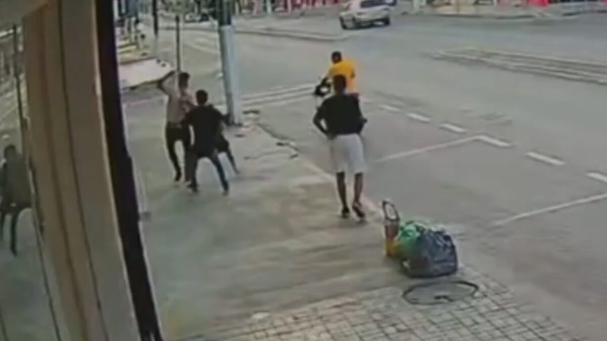 O caso aconteceu no último sábado (7), por volta das 5h30. As agressões começam com dois homens, que perseguem a vítima na rua, derrubando-a em seguida, conforme registro de câmera de videomonitoramento. Em seguida, um terceiro chega de moto, desce, chute e pisa na cabeça do homem caído. Um quarto aparece e arremessa um capacete em direção ao vendedor, que segue no chão.