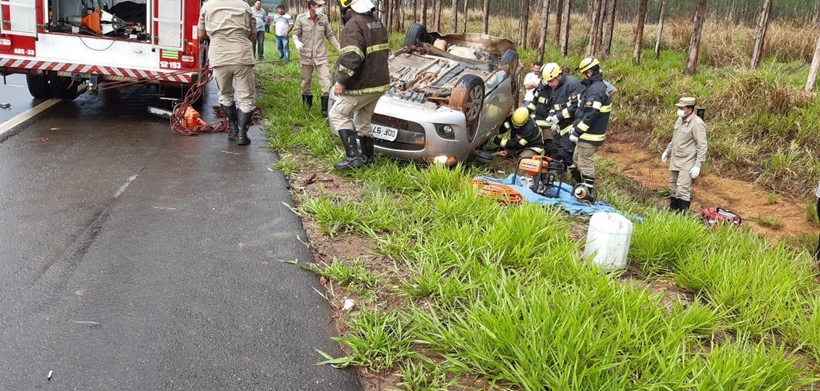 De acordo com informações da corporação, o acidente aconteceu por volta das 13h40. O carro teria deslizado na estrada molhada, depois saiu da pista e capotou.