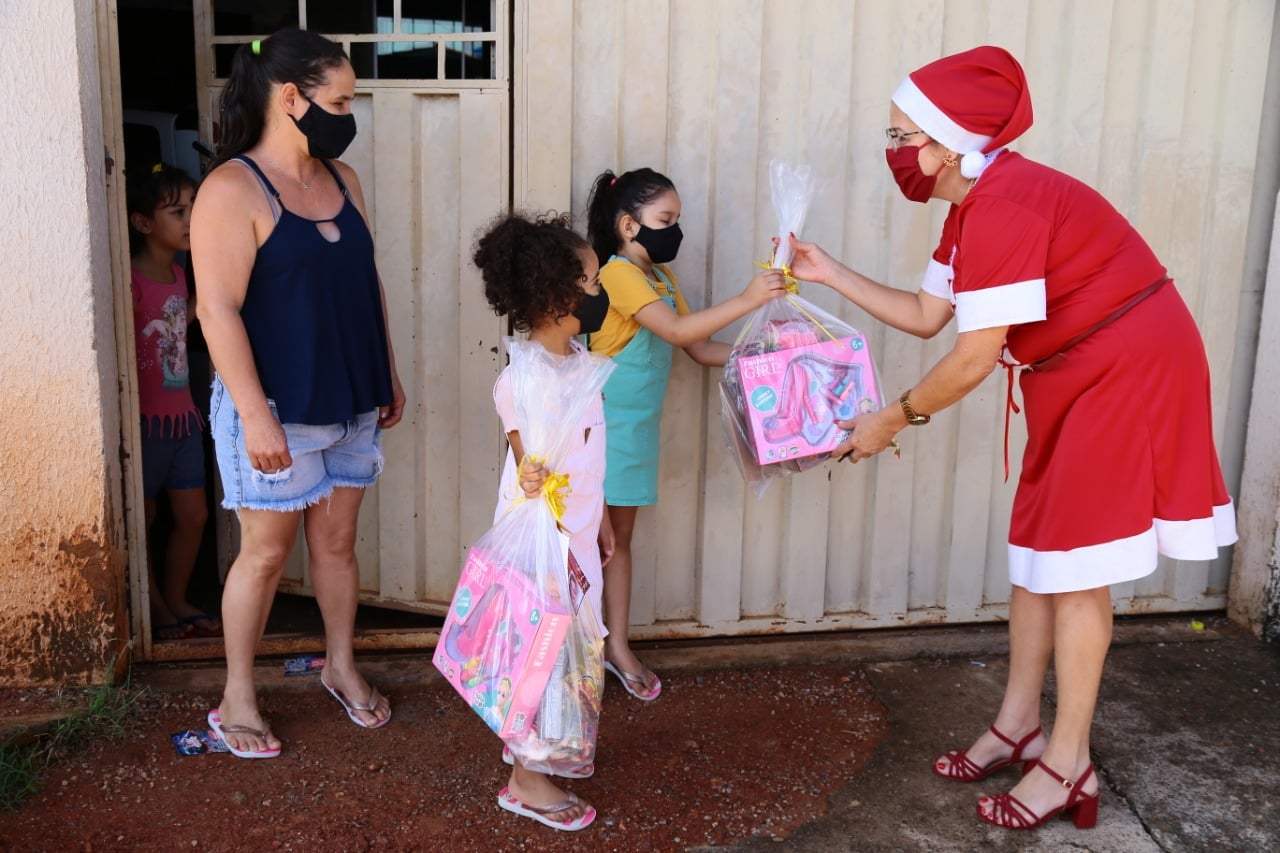 Vestida de Mamãe Noel, professora visita casa de alunos de escola pública em Aparecida