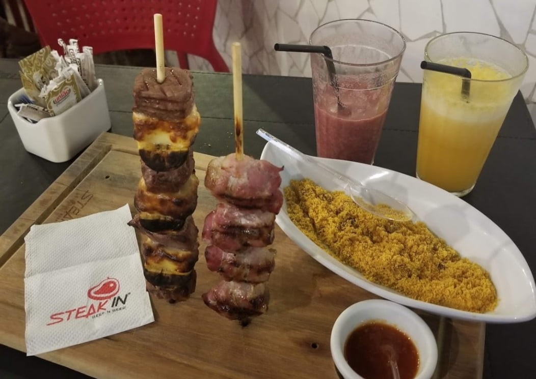 No Parque Amazônia também tem opção para quem está em busca dos melhores espetos em Goiânia. Além da tradicional jantinha da casa, que acompanha feijão, mandioca e tomate, também dá para escolher espetinhos para todos os gostos.