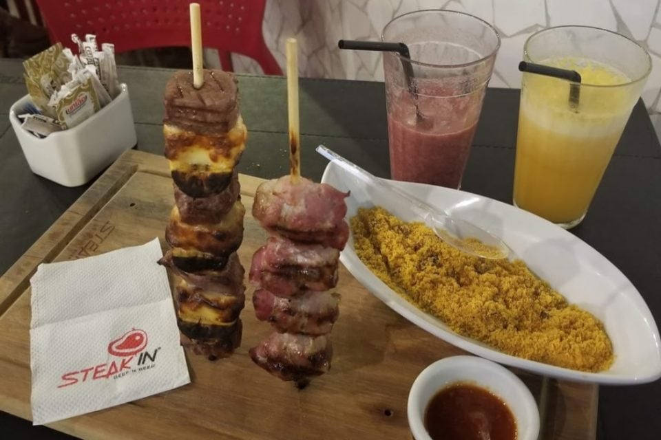 No Parque Amazônia também tem opção para quem está em busca dos melhores espetos em Goiânia. Além da tradicional jantinha da casa, que acompanha feijão, mandioca e tomate, também dá para escolher espetinhos para todos os gostos.