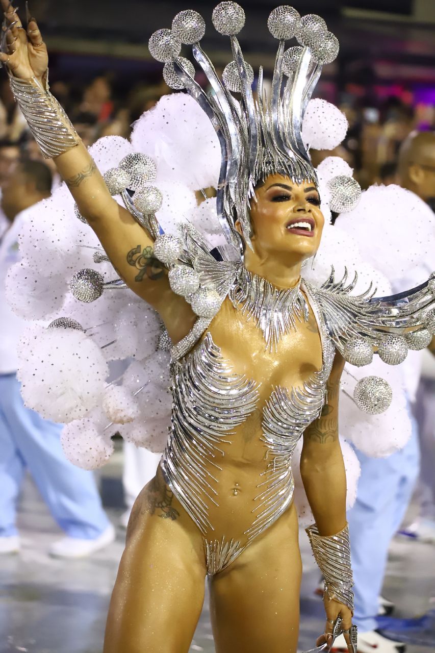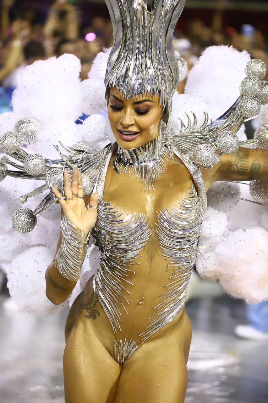 A atriz Aline Riscado arrasou na Marquês de Sapucaí no Carnaval 2020 com fantasia prateada mínima representando uma colombina.