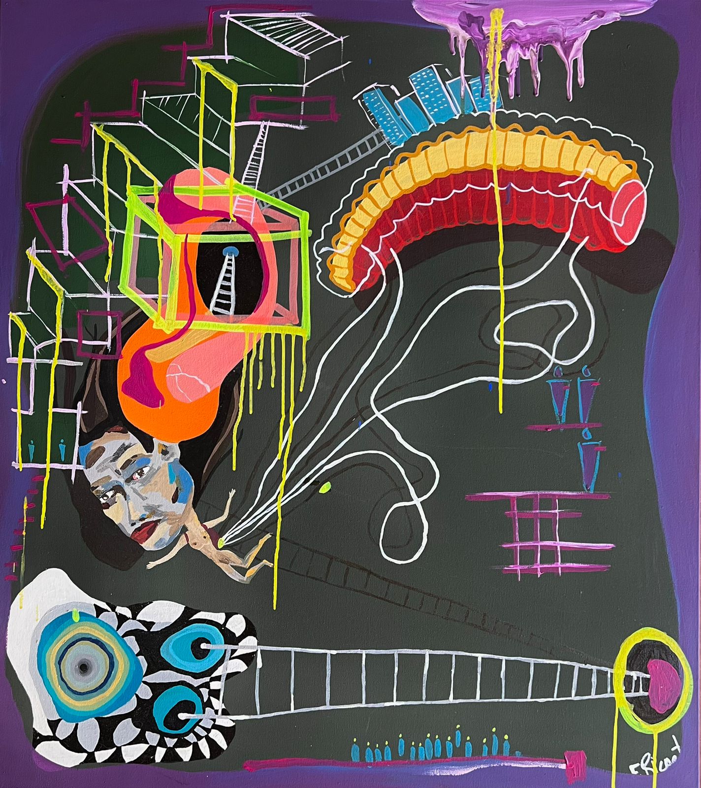 “Sempre gostei de expressões artísticas em geral. A pintura vem desde a infância, mas agora, já adulto, estou respeitando minhas vontades e me livrando do julgamento próprio”, conta Fausto. Com uma estética que ele define como abstrato surrealista, o artista afirma que a arte é uma forma de escapar da realidade e mergulhar nos próprios pensamentos. “Essas obras têm muito dos meus últimos três anos — momentos felizes, tristes, viagens, sentimentos confusos e distintos.”