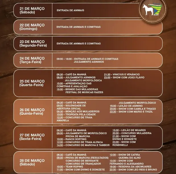 A programação inclui ainda desfiles, cavalgadas, provas com muares, concursos gastronômicos — como a famosa Queima do Alho —, além de shows de música raiz, rodas de viola e leilões. A diversidade de atividades reforça o caráter cultural e festivo do evento.