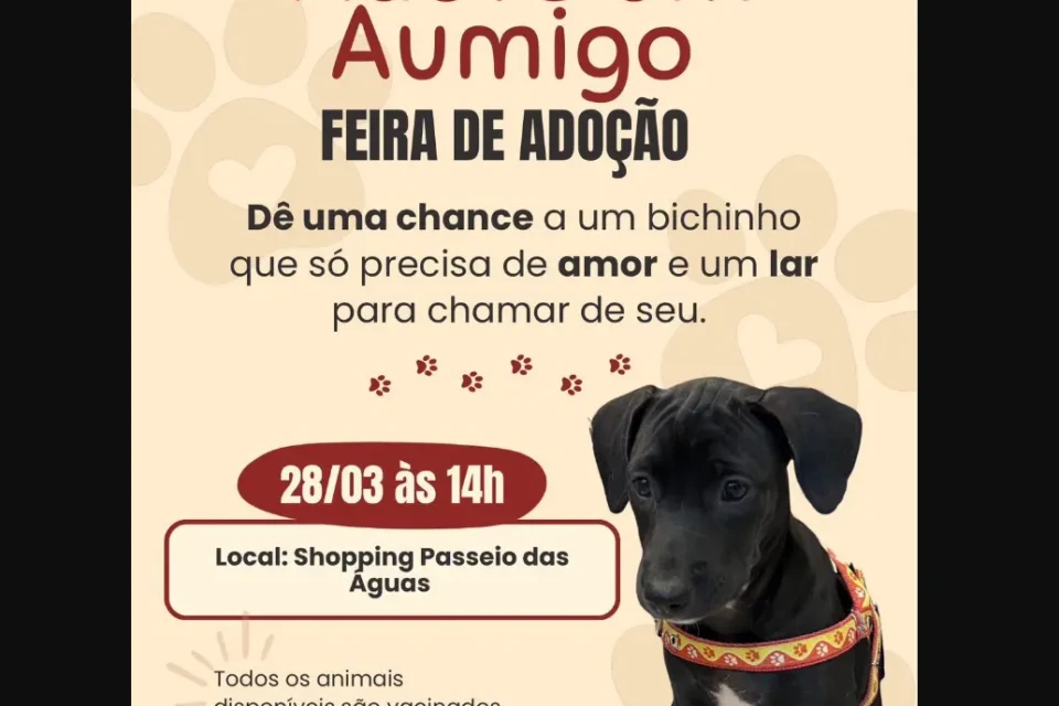 Uma feira de adoção de cães será realizada neste sábado (28), em Goiânia, oferecendo a oportunidade para quem deseja encontrar um novo melhor amigo. O evento acontece às 14h, no Shopping Passeio das Águas, e é promovido pela ONG Focinho Caridoso.