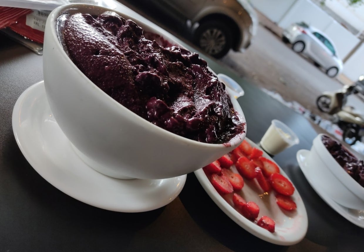 O açaí da casa é cremoso e consistente, sem aquele doce forte presente em alguns. Entre as opções, é possível pedir o tradicional, açaí batido com morango, creme de açaí e a bomba.