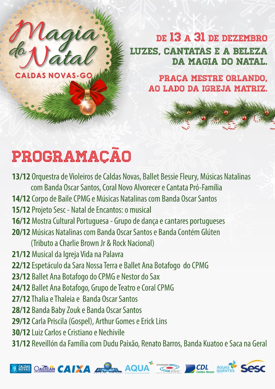 A Prefeitura de Caldas Novas preparou uma programação especial para o Natal deste ano. Além da tradicional Casa do Papai Noel, que foi instalada na Praça Mestre Orlando (Praça da Igreja Matriz), os moradores e os turistas que estiverem na cidade poderão aproveitar uma agenda repleta de shows e apresentações culturais.As atividades do Natal na cidade das águas quentes começa nesta quinta-feira (13) com um show da Orquestra de Violeiros de Caldas Novas. Depois, irão se apresentar o Ballet Bessie Fleury, um projeto de inclusão social que tem o apoio da prefeitura municipal, através do grupo SuperJovem. As músicas natalinas ficarão por conta da Banda Oscar Santos, do Coral Novo Amanhecer e da Cantata Pró-Família.