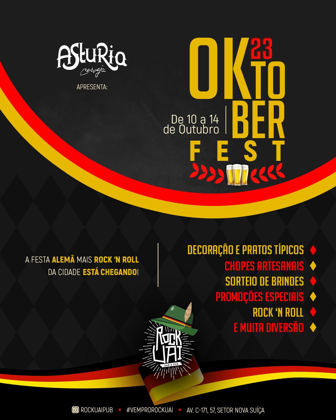 Entre os dias 10 e 14 de outubro, o Rock Uai Pub recebe o Oktober Rock Uai 2023, evento que mistura o melhor da tradicional festa alemã com um bom rock’n roll. A casa preparou uma programação com decoração exclusiva, pratos típicos, promoções especiais, sorteios de brindes e, claro, o melhor do Rock. A programação completa pode ser conferida no perfil do pub no instagram.