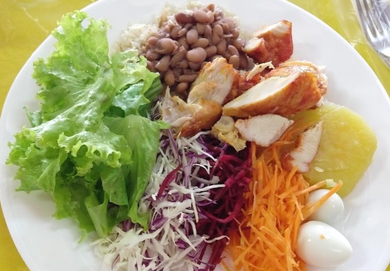 Ao fazer seu pedido, é possível personalizar sua refeição de acordo com os pratos disponíveis no self-service da casa. Dá para escolher entre o arroz branco e o integral, o tipo de feijão, macarrão, legumes, farofas e muito mais.