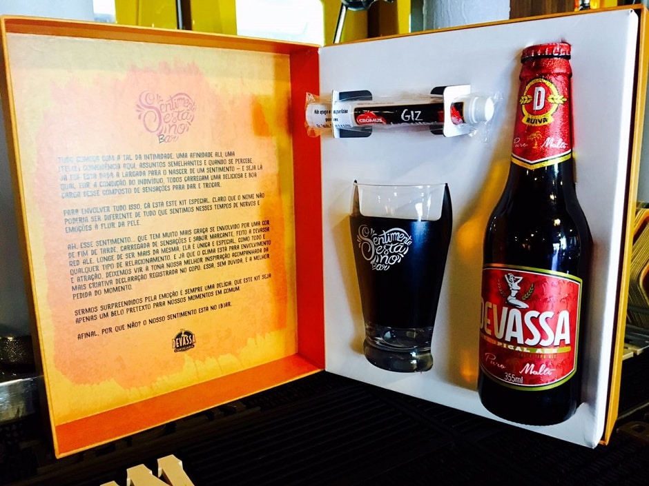 Com R$99,90 de consumação na Cervejaria Devassa, os pombinhos levam para casa um copo-lousa em que é possível registrar mensagens. Também está à venda o kit “O Sentimento Está no Bar”, com 1 copo-lousa + 1 caneta giz + 1 long neck Ruiva (Red Ale), em caixa de presente personalizada por R$ 49,90.