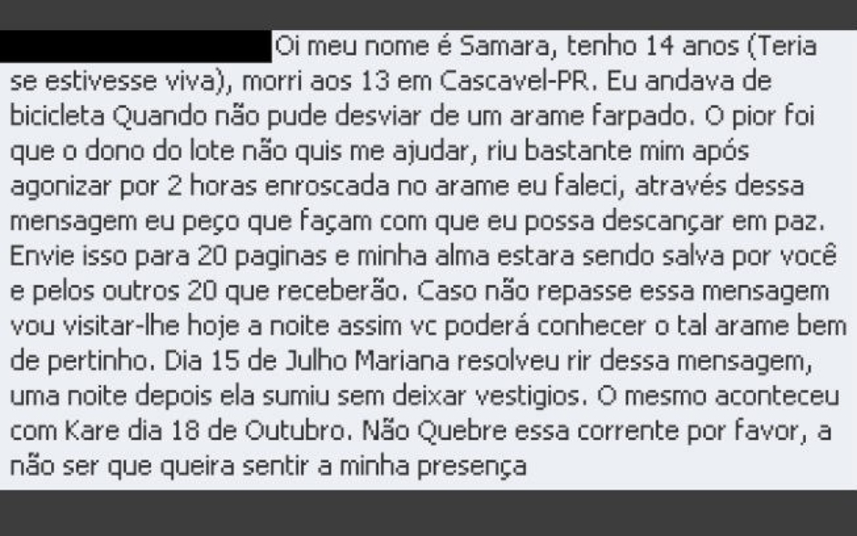 Ainda na época do Orkut, circulava nas comunidades a história de Samara, uma menina que tem 14 anos (teria, se estivesse viva) e morreu enrolada em um arame farpado na cidade de Cascavel (PR). Segundo o texto da corrente, os internautas deveriam repassar a mensagem da garota para 20 comunidades em menos de 2h para que sua alma pudesse descansar em paz.