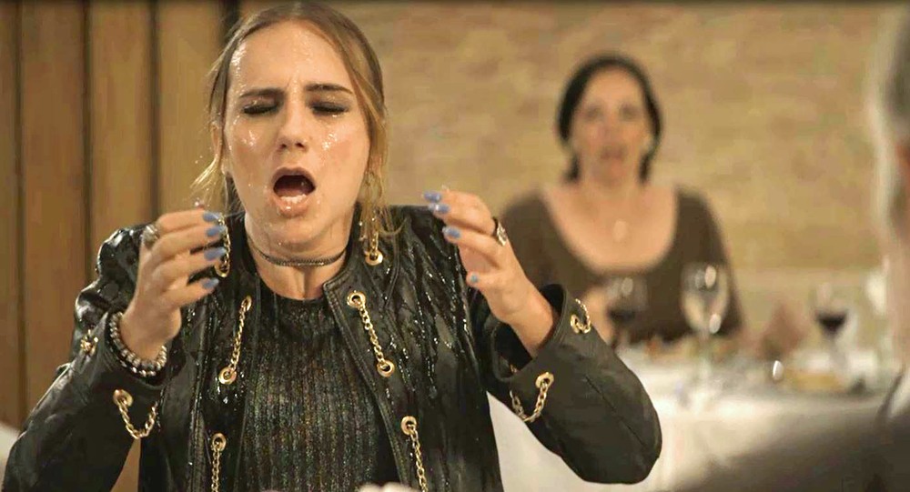 É então que Jô perde a cabeça e taca vinho na cara da loira: