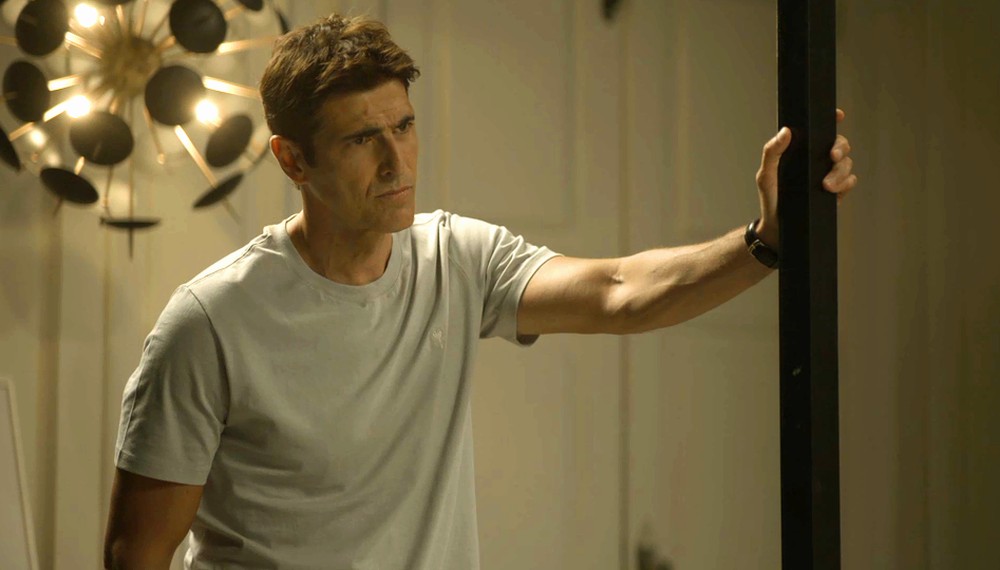 Desesperada quando Régis pega a mala de roupas, Jô o segue pela mansão, tentando convencê-lo a ficar;