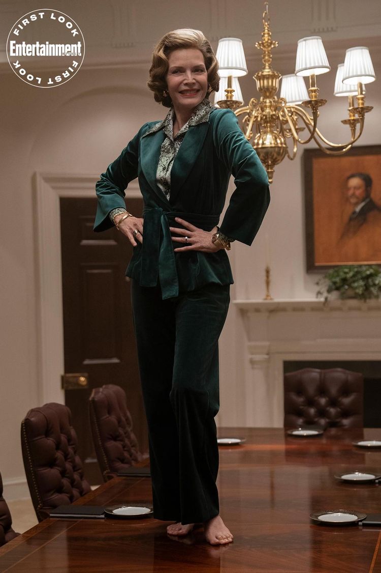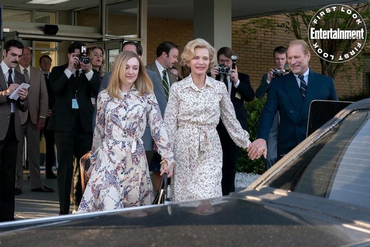 Pfeiffer aparece em toda a sua glória dos anos 1970 como Betty Ford, correndo por uma multidão ao lado de Dakota Fanning como sua primeira filha, Susan Ford, e parada sozinha em cima de uma mesa de jantar em um terninho de veludo verde.