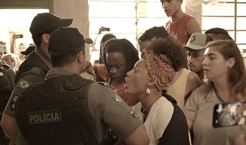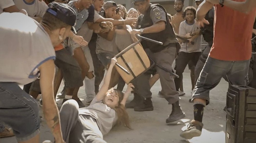A professora recusa a acabar com sua aula de História e acaba sendo agredida por Veiga, que dá um tapa em sua mão. Os estudantes pegam seus celulares e filmam a ação, pedindo o fim da violência. O policial não se dá por vencido e começa a quebrar as cadeiras do colégio, causando ainda mais revolta dos alunos. Do lado de fora da escola, repórteres filmam e documentam toda a ação da polícia.