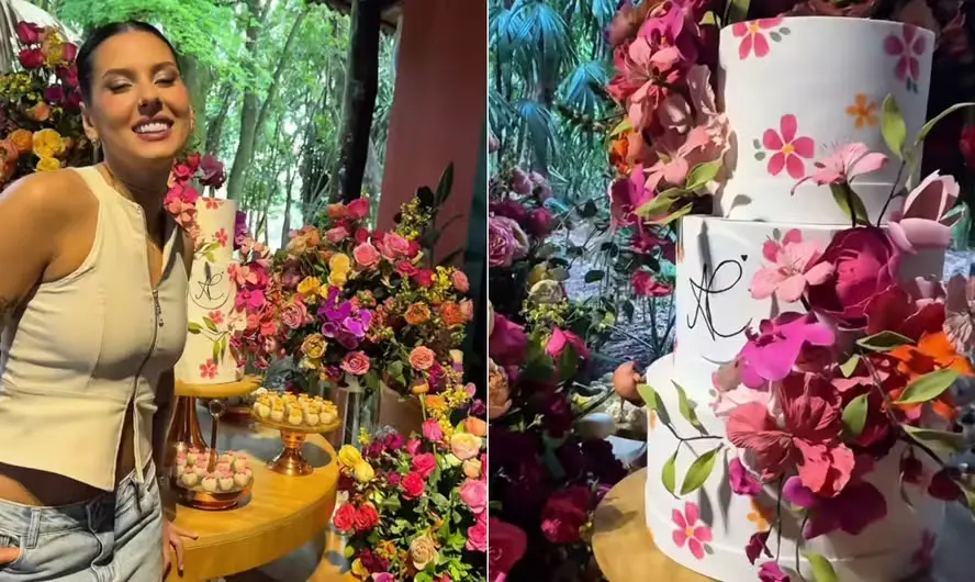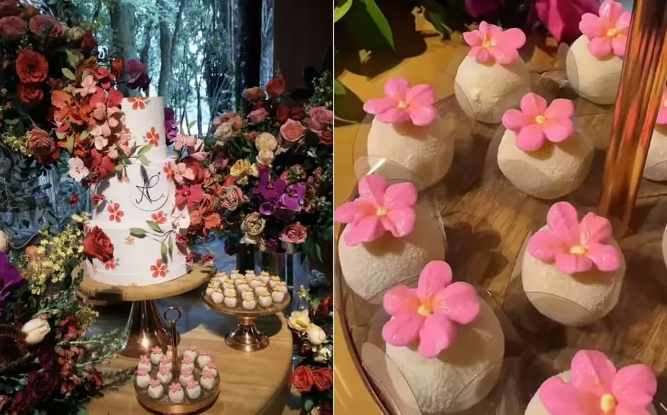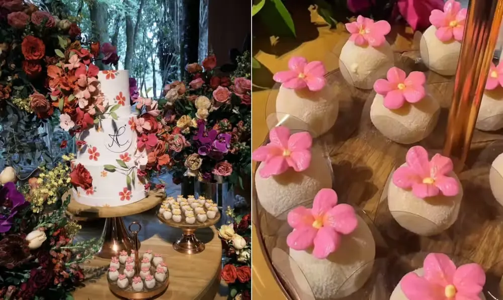 A mesa do evento chamou atenção: bolo de três andares decorado com flores, arranjos vermelhos, roxos, rosas e amarelos espalhados pelo salão e docinhos temáticos. Do lado de fora, um churrasco era preparado em estruturas de ferro giratórias, enquanto um bar servia drinques como moscow mule (com foto da cantora que “derrete” na bebida), bramble, whisky sour e caipirinhas.