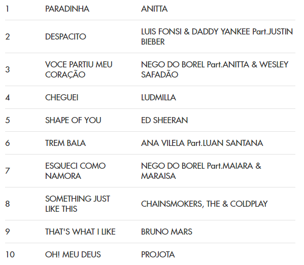 Ed Sheeran, Bruno Mars, Ludmilla, Ana Vilela, Projota e Chainsmokers também aparecem dentre os artistas mais tocados no Brasil. Você pode conferir a lista completa aqui.