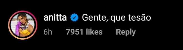Gente como a gente, Anitta também admira os boys nas redes sociais. Vendo um vídeo em que Arthur perde a paciência no BBB 21, a cantora se abriu nos comentários. “Gente, que tesão”, escreveu em um Instagram de fofocas.