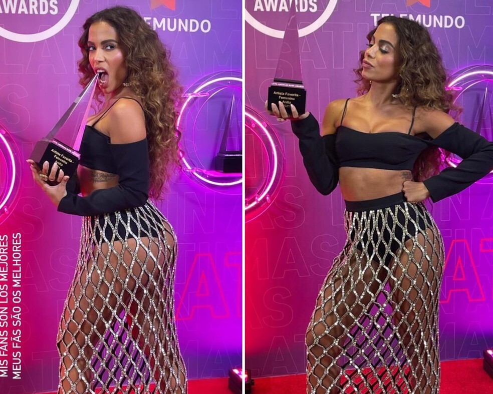Já na hora de receber o prêmio, Anitta usava um top com mangas pretas, que deixava sua barriga de fora e uma saia transparente e brilhante com uma calcinha fio-dental, feito pelo estilista David Koma.