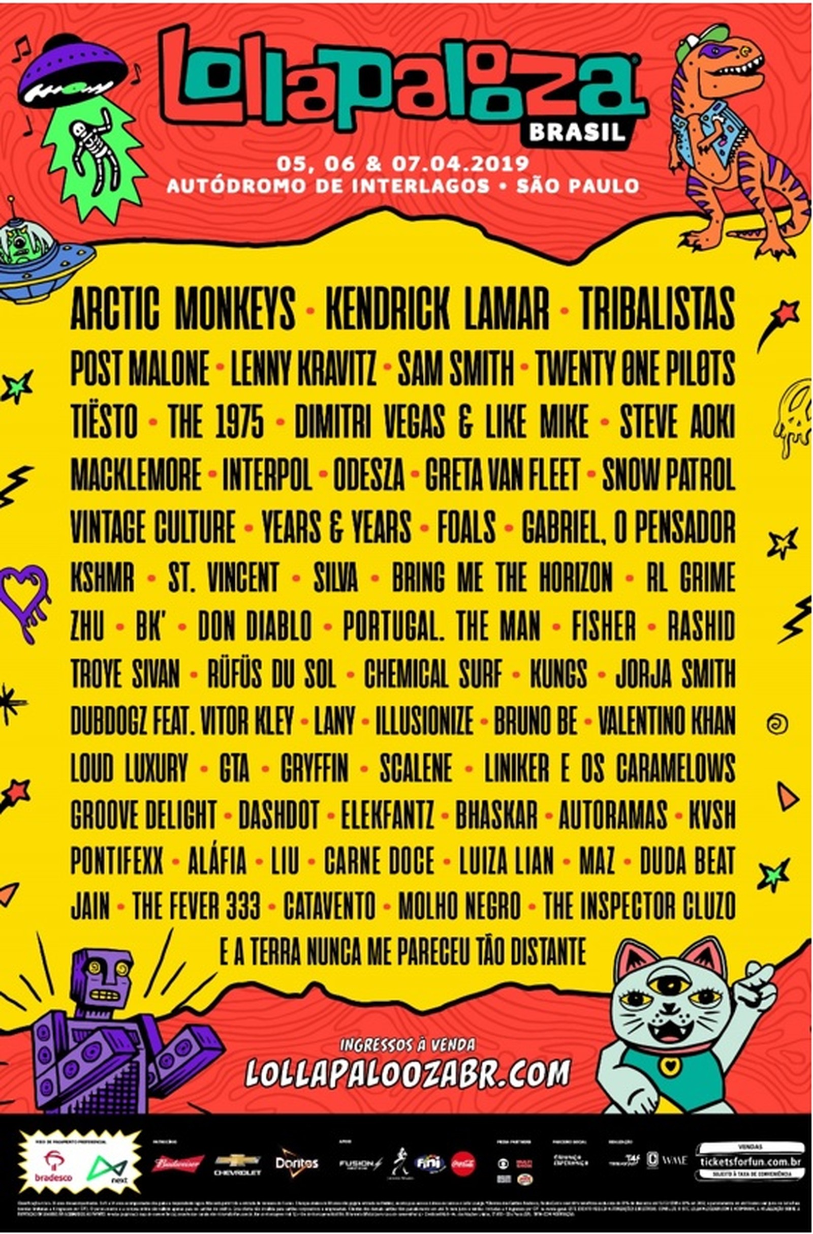 A organização do Lollapalooza 2019 divulgou nesta quarta-feira (21) o line-up completo do festival. Arctic Monkeys, Kendrick Lamar e Tribalistas foram confirmados como as atrações principais do evento. Sam Smith, The 1975, Lenny Kravitz e os goianos da banda Carne Doce também estão se apresentarão.