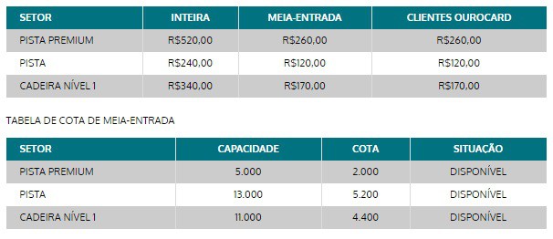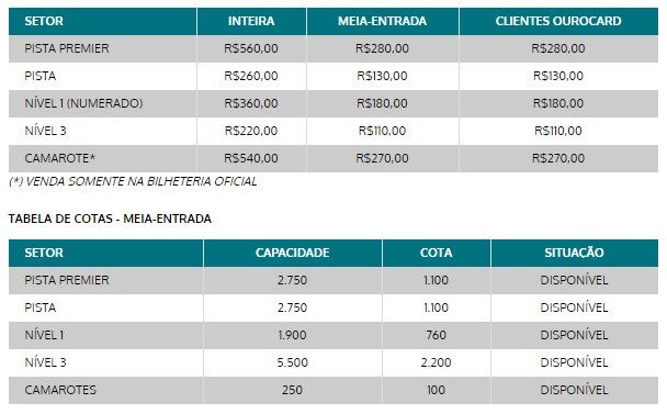 A Livepass, empresa responsável pela venda dos ingressos, divulgou os valores nesta quinta-feira (20), que ficam entre R$ 220 e R$ 560