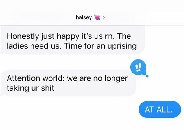 As duas comadres do pop trocaram algumas mensagens sobre o assunto e Grande compartilhou um pedacinho da conversa no Instagram Stories. “Honestamente, estou feliz que somos nós [no topo]. As mulheres precisam de nós. É tempo de uma rebelião”, escreveu Halsey.