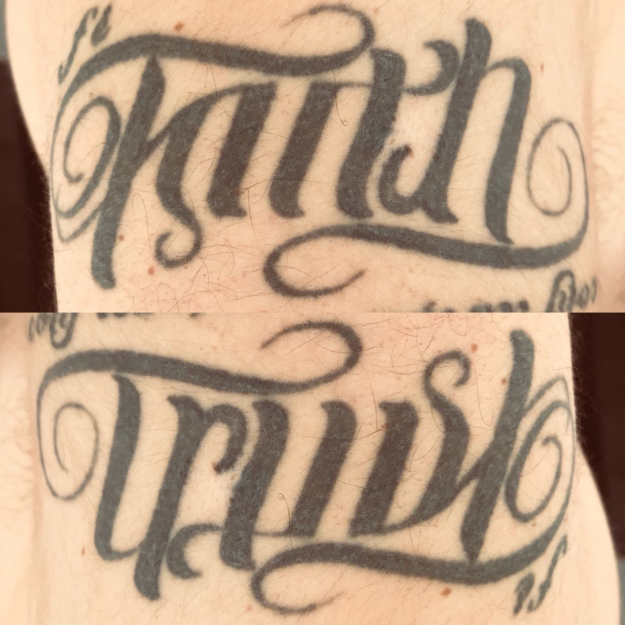 Tatuagem é um ambigrama que, em português pode ser traduzido como Fé e Confiança (Foto: reprodução)