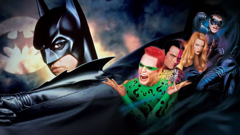 Visando vender mais brinquedos, o filme adiciona Robin (Chris O’Donnel) como o sidekick de Batman (agora Val Kilmer), e escala dois vilões bem mais energéticos e extravagantes do que Pinguim e Mulher-Gato. Tommy Lee Jones encarna sua versão ‘Jack Nicholson de Coringa’ do personagem Duas Caras, e Jim Carrey (no auge absoluto da carreira), foi o grande chamariz como o vilão Charada. O resultado é um excesso de poluição visual em uma Gotham City excessivamente cheia de estátuas, e cores, e mais cores, e mais cores (!!!).
