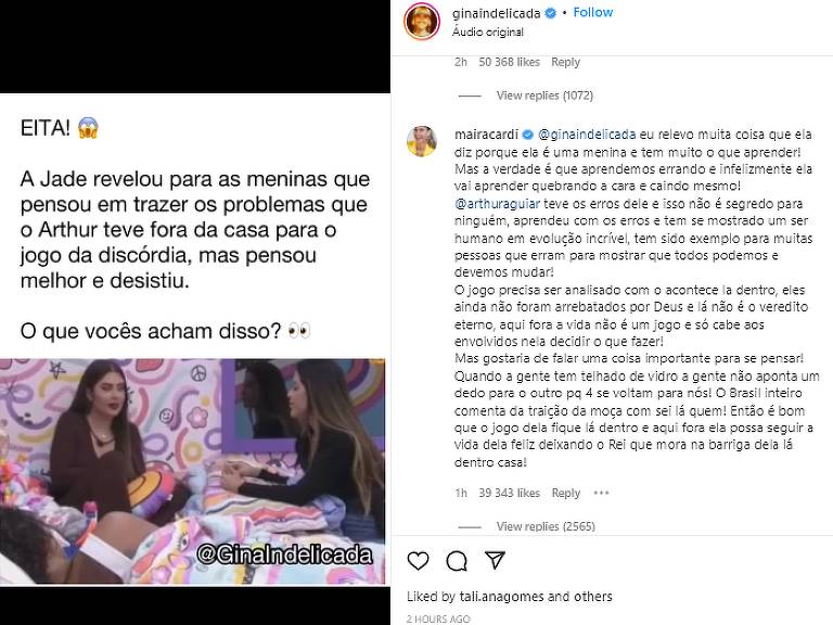 “Eu relevo muita coisa que ela diz porque ela é uma menina e tem muito o que aprender! Mas a verdade é que aprendemos errando e infelizmente ela vai aprender quebrando a cara e caindo mesmo! Arthur teve os erros dele e isso não é segredo para ninguém, aprendeu com os erros e tem se mostrado um ser humano em evolução incrível, tem sido exemplo para muitas pessoas”, disse Maíra Cardi no comentário.