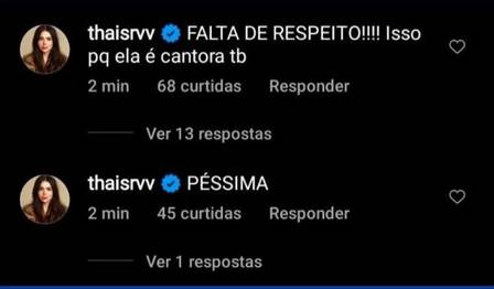 Thais saiu em defesa do marido e criticou Naiara, sem citar nomes. “Falta de respeito. isso porque ela é cantora também. Péssima”, escreveu ela.