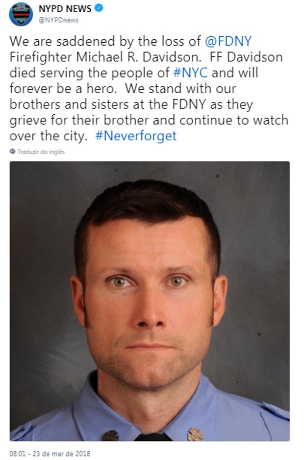 Michael Davidson e outros 175 bombeiros tentaram conter o fogo em um prédio na cidade de Nova York durante a noite desta quinta-feira (22)