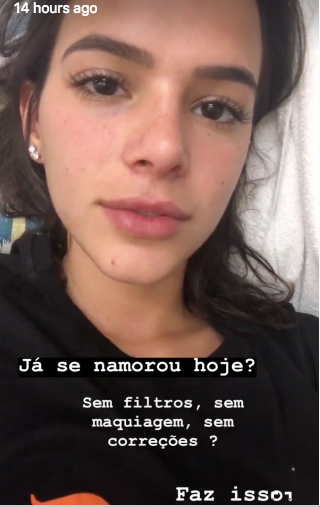 "Já se namorou hoje? Sem filtro, sem maquiagem, sem correções", escreveu a atriz em uma foto postada no Stories do Instagram