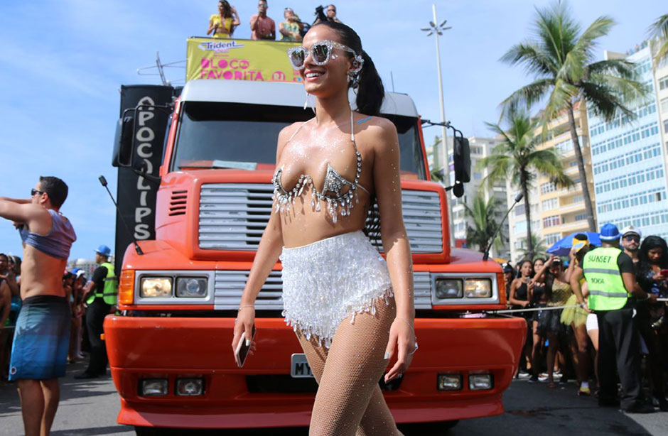 Depois de arrasar no Carnaval 2017 com uma fantasia de unicórnio, Bruna Marquezine decidiu inovar e ousar um pouquinho mais neste ano. Musa do Bloco da Favorita, comandado por Carol Sampaio, a atriz apareceu com um look bem brilhante e sexy.