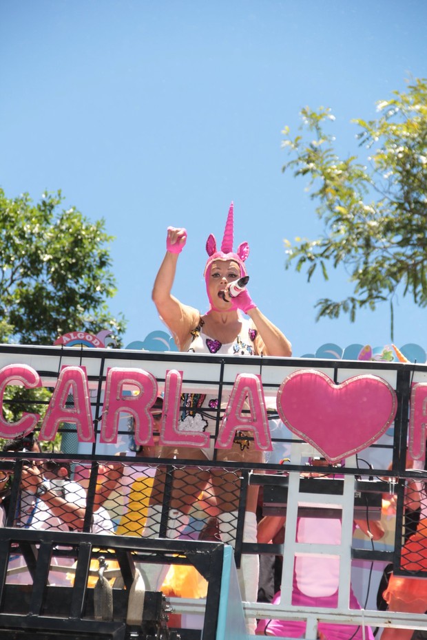 O trio elétrico de Carla é voltado para o público infantil, e por isso ela tirou foto com várias crianças antes da apresentação.Ao começar o o trio, Carla se mostrou muito animada. “Vamos todos sair do chão e caprichar na coreografia. Hoje é o nosso dia!”, afirma.